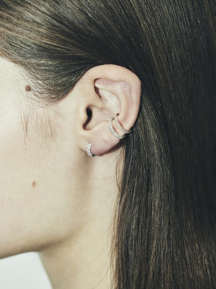 小ぶりながらも、ひとつひとつの輝きが上品に耳元を彩ります。シンプルで高級感のあるデザインは、スキンジュエリーとしてもおすすめ。